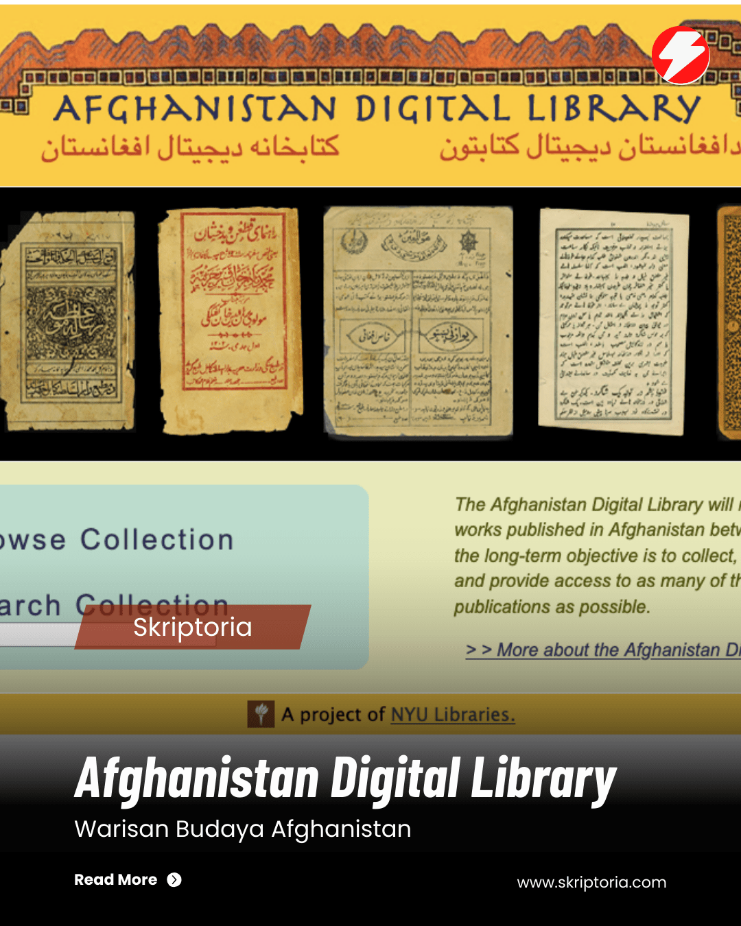 Perpustakaan Digital Afghanistan merupakan proyek yang diprakarsai oleh Perpustakaan Universitas New York. Pelaksanaan proyek ini didukung oleh beberapa lembaga pendanaan internasional. Di antaranya adalah National Endowment for the Humanities, Reed Foundation, dan W.L.S. Spencer Foundation. Dukungan dari berbagai lembaga ini memungkinkan proyek pelestarian budaya tersebut berjalan secara berkelanjutan. Melalui kerja sama internasional, warisan penerbitan Afghanistan diharapkan dapat tetap terjaga dan dikenal oleh generasi mendatang. Enter
