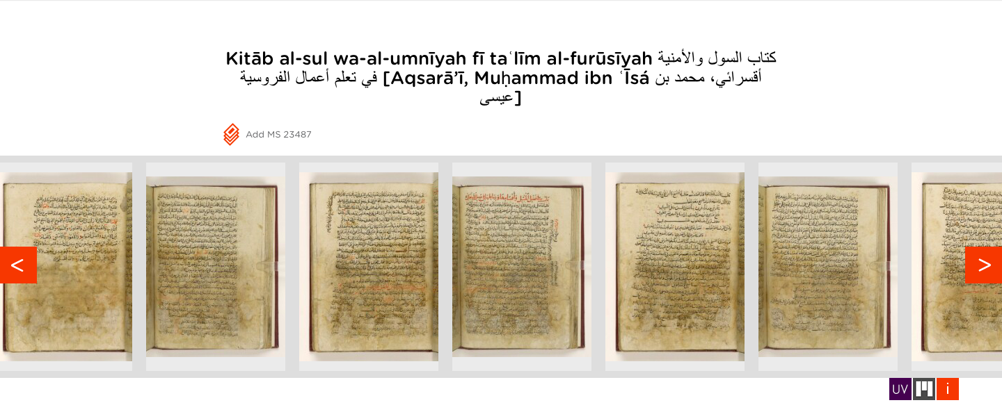 Penunggang kuda Mamluk, seni militer dan teknologi, juga dikenal sebagai Nihāyat al-swal-umnīyah fī taʿlīm amal al-furūsiyya (نهاية السول والأمنية تعليم الفروسية), dikaitkan dengan Muḥammad ibn ‘Īsá al Ismā’īl -Ḥanafī al-Aqsarā’ī (أقسرائي، اسماعيل) meninggal 1349. Salinan tersebut diselesaikan pada 20 Syabān 785/18 Oktober 1383 oleh juru tulis Alī ibn āmid ibn Abī Bakr al-Buwayṭī al-Shāfiʿī (علي ابن حامد ابن ابي البويطي الشافعي, lihat kolofon , f. 166r)