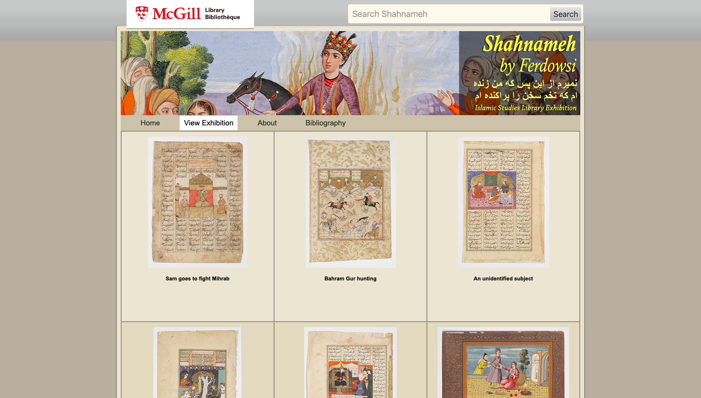 Barang-barang yang dipamerkan berasal dari koleksi McGill’s Rare Books and Special Collections and Islamic Studies Libraries yang berlokasi di Gedung Perpustakaan McLennan, Lantai 4. Ada 16 ilustrasi Persia yang mewakili berbagai episode dalam kisah Shahnameh. Lukisan-lukisan itu sendiri berkisar dari abad ke-14 hingga abad ke-18. Mungkin barang yang paling mengesankan yang dipamerkan adalah Demotte Shahnameh (MS Persia 3) yang dilukis di Tabriz, di ca. 1350 menjadikannya salah satu manuskrip Shahnameh tertua yang diketahui di dunia. Ini dinamai dealer yang bertanggung jawab atas penyebarannya, dan McGill beruntung memiliki 2 lembar dari naskah ini. Spesimen yang tersisa bervariasi dari daun manuskrip individu hingga lukisan mini dan jilid pernis.
