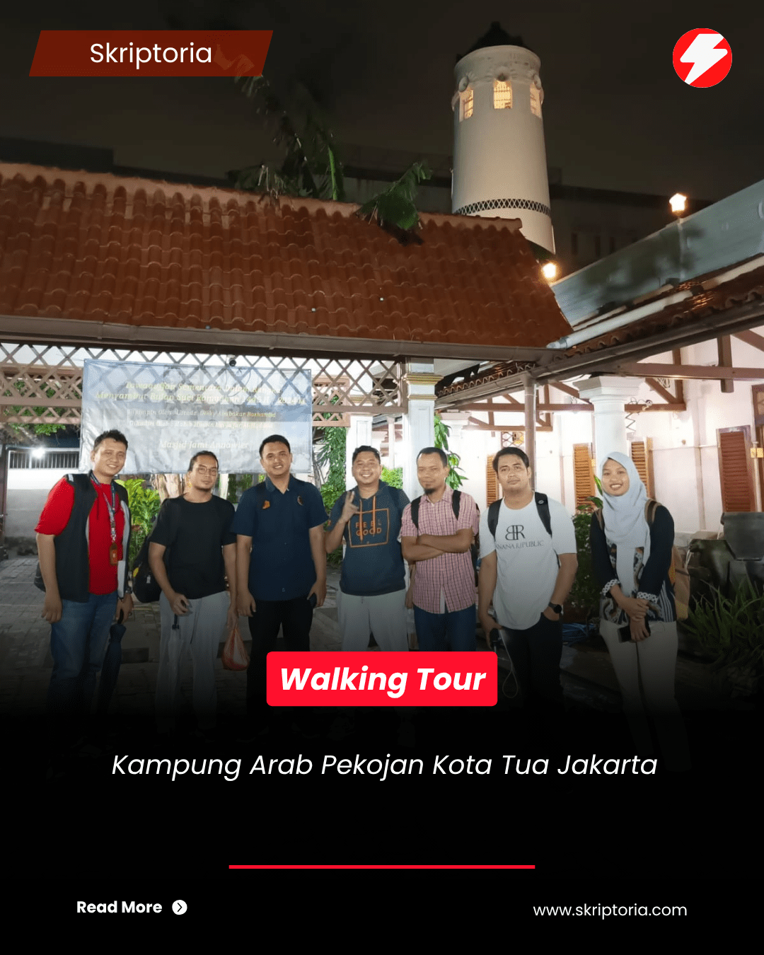 Saya berjalan, menuju titik yang telah disepakati. Jembatan Budaya, di depan Toko Merah. Lokasi strategis yang dikelilingi bangunan bersejarah. Di sekitar area, disediakan bangku yang enak untuk duduk-duduk berisirahat menikmati suasana sore. Pukul 16.00 WIB kami berkumpul dan berjalan melewati Toko Merah dipandu oleh Haidar Husein. Toko Merah, sebuah bangunan dengan ciri khas merah bekas kediaman Gubernur Jenderal Gustaaf Willem baron van Imhoff. Terletak di tepi barat kali Besar Kota Tua sebagai salah satu bangunan tertua di Jakarta yang kini berfungsi sebagai museum.